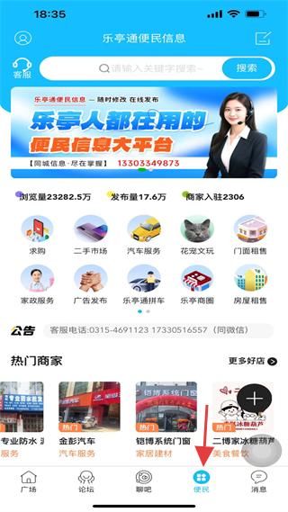 4、便民是樂亭便民信息平臺,有求購、二手市場等入口,涵蓋汽車服務等分類,展示熱門商家信息,提供同城便民服務。