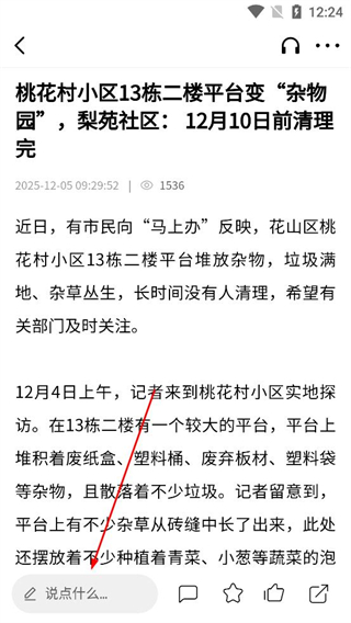 3、在資訊詳情頁查看小區雜物堆積的情況、社區的處理方案等內容,了解事件的具體信息,點擊評論區參與評論。