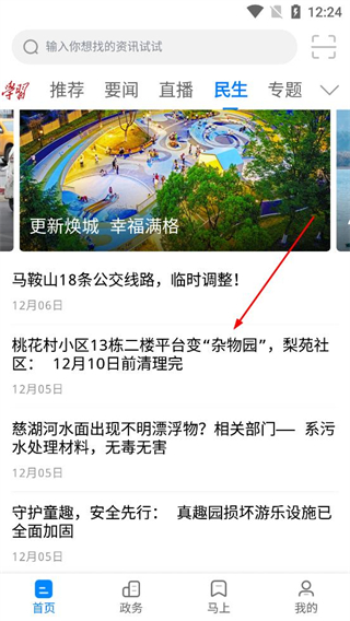 2、登錄后進入民生板瀏覽資訊列表選擇桃花村小區雜物清理的資訊,點擊進入詳情閱讀頁面。