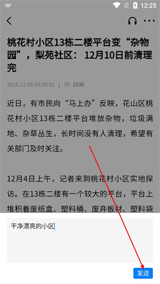 4、在評論輸入框中輸入干凈漂亮的小區,點擊發送按鈕完成評論互動,參與資訊的討論。