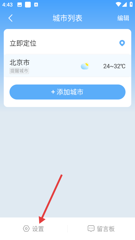 1、打開APP進入城市列表頁面,這里可以進行城市的添加和編輯操作,若要設置天氣提醒時間,首先點擊頁面底部的設置按鈕進入設置頁面,這是設置時間的第一步操作。