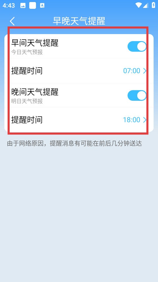 3、進入早晚天氣提醒設置頁面后,根據自己的需求開啟或關閉早間和晚間天氣提醒,并設置具體的提醒時間,設置完成后天氣提醒將按照你設定的時間進行推送。