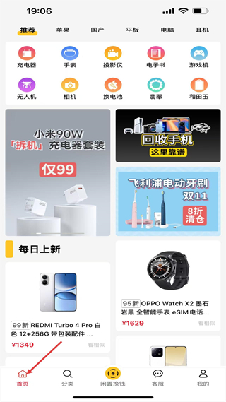 1、首頁有多個數碼分類,展示小米充電器、手機回收等內容,還有每日上新數碼產品,方便用戶瀏覽選購。