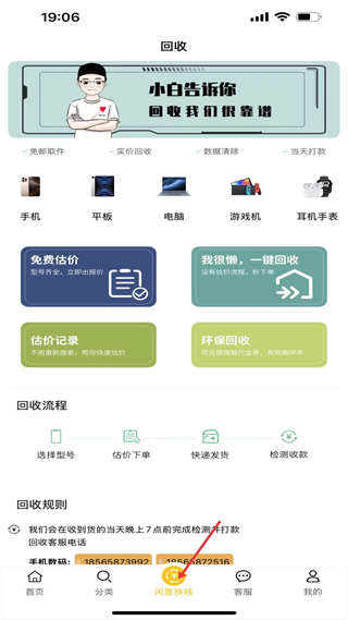 2、閑置換錢界面提供數碼回收服務,有免費估價等功能,明確回收流程,標注回收規則和客服電話,助用戶閑置變現。
