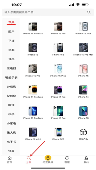 3、分類界面可按類別找產品,以蘋果手機為例展示多個型號,方便用戶精準查找所需數碼產品。