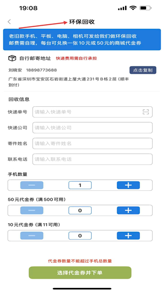 4、環?;厥蔗槍吓f數碼產品,用戶自付郵費可兌代金券,需填郵寄和寄件信息,選代金券后下單,促環保并給購物優惠。