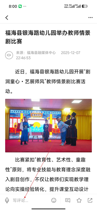2、登錄后進入首頁推薦板塊瀏覽資訊列表,選擇福海縣銀海路幼兒園教師情景劇比賽的資訊,點擊進入詳情頁面。
