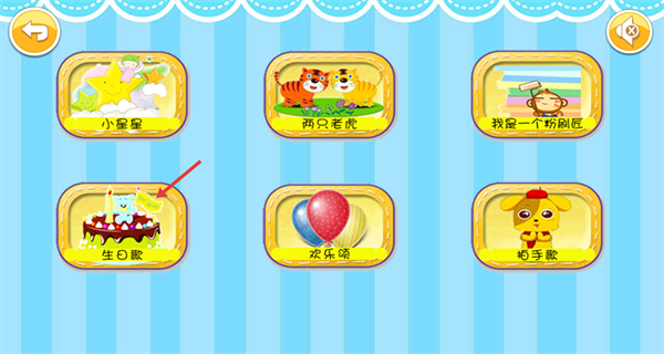 2、進入后呈現多首兒歌的選擇界面,包含小星星兩只老虎生日歌等歌曲卡片,點擊想要體驗的歌曲卡片,就能進入該歌曲對應的演奏互動環節。