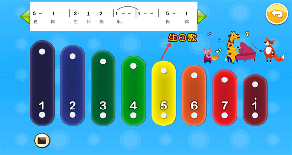 3、進入歌曲演奏界面后,上方會顯示對應歌曲的樂譜提示,下方排列著不同顏色的音階按鈕,按樂譜提示點擊對應音階按鈕,完成歌曲演奏。