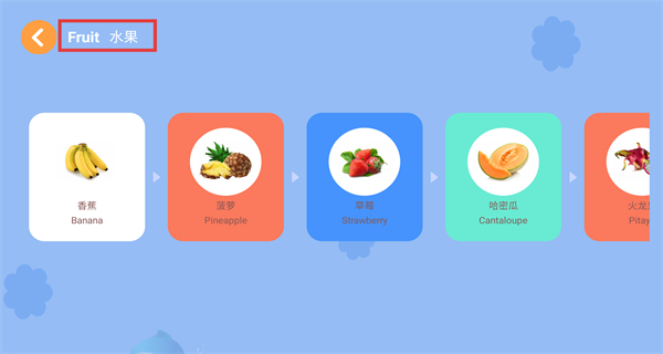 3、水果分類頁呈現多款常見水果的圖文卡片,每款水果都搭配中英雙語標注,幫助兒童建立對應的雙語認知關聯。
