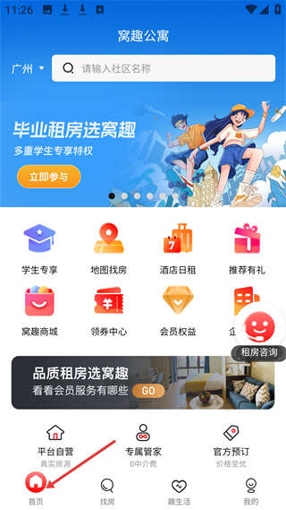 1、點擊首頁,定位廣州,有學生專享等功能區,宣傳畢業租房,凸顯平臺自營等優勢。