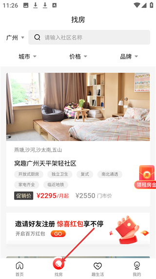 2、找房頁可篩城市、價格,展示天平架輕社區房源,促銷價2295元月起,邀好友注冊領紅包,找心儀租房。