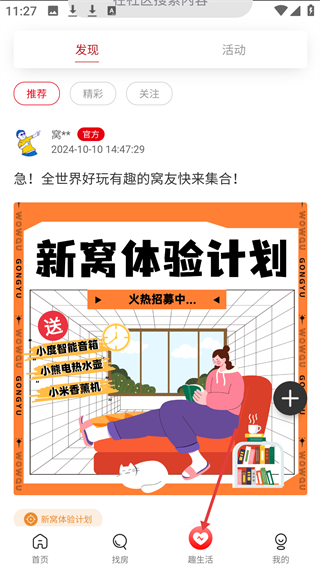 3、趣生活頁有發現、活動板塊,新窩體驗計劃招募送小度音箱,可參與社區互動,體驗租房趣味生活。