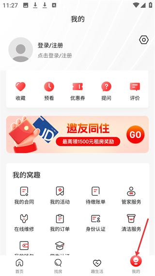4、我的頁可登錄管理收藏、優惠券,邀友同住領租房獎勵,還能查合同、賬單,享管家、在線維修服務。