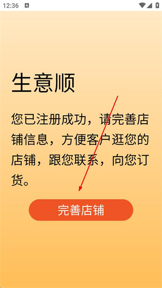 1、打開軟件看到注冊成功提示,點擊完善店鋪按鈕,進入完善店鋪信息的頁面,準備填寫店鋪資料。