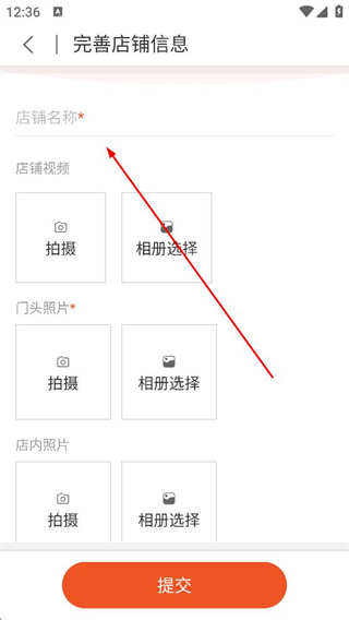 2、在完善店鋪信息頁填寫店鋪名稱,通過拍攝或相冊選擇上傳店鋪視頻門頭照片等素材。