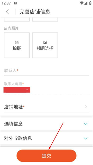3、繼續填寫聯系人聯系電話店鋪地址等必填信息,確認內容完整后點擊提交按鈕完成信息完善。