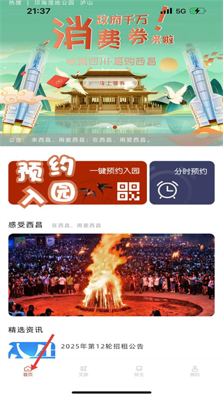 1、 首頁有政務府千萬消費券領取入口,可預約入園,展示感受西昌的活動場景與精選資訊。