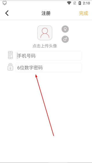 1、打開情侶我和你軟件,進入注冊頁面,上傳頭像并填寫手機號碼、6位數字密碼,完成賬號注冊流程。