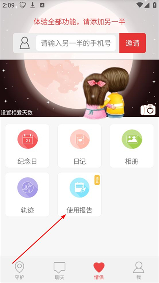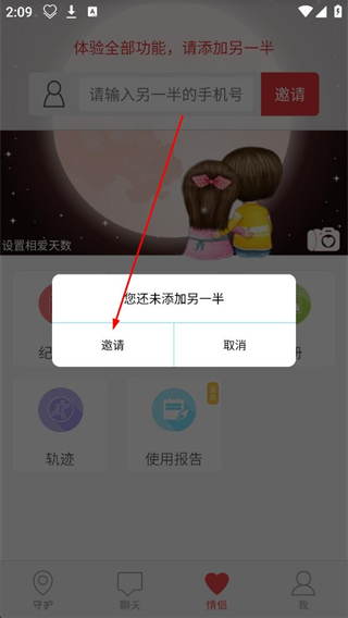 2、注冊后進入情侶頁面點擊使用報告功能,彈出還未添加另一半的提示框,選擇邀請選項。
