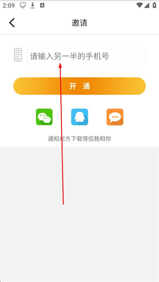 3、在邀請頁面的輸入框中填寫另一半的手機號碼,準備通過該方式邀請對方加入軟件。