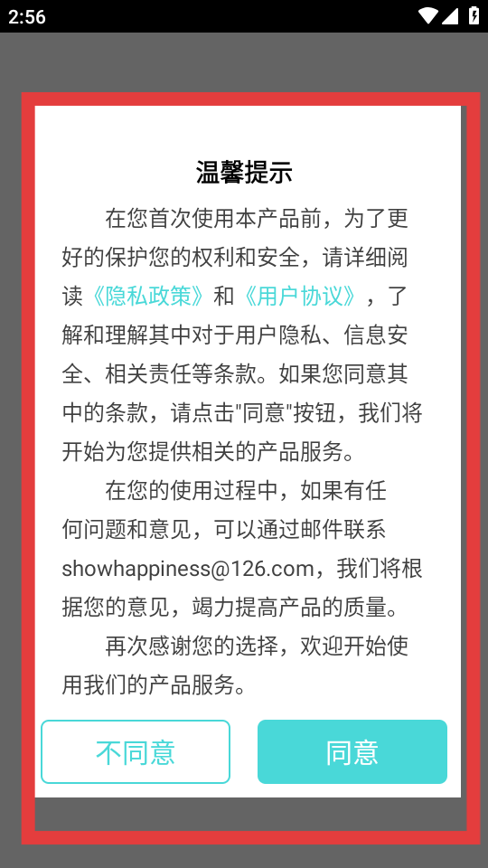 1、首次使用前閱讀隱私政策和用戶協議,選擇同意或不同意,同意后可開始使用產品服務,若有問題可發郵件咨詢。