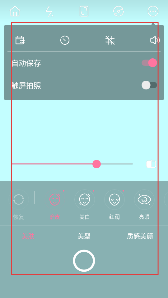 4、在設置界面開啟自動保存、觸屏拍照,調整美膚參數,選擇磨皮、美白等效果,拍攝并美化照片,保存美化成果。