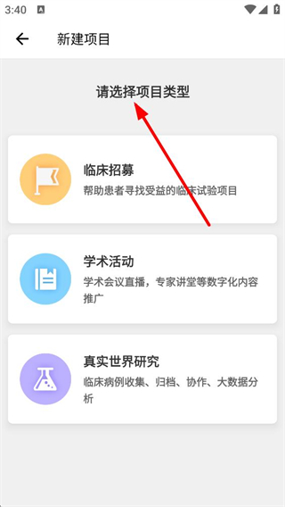 4、進入新建項目頁面需選擇項目類型,包含臨床招募、學術活動、真實世界研究等選項,不同類型對應不同的項目功能與應用場景。