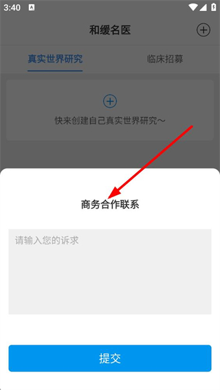 3、真實世界研究板塊點擊加號,可觸發商務合作聯系窗口,填寫訴求后提交,即可發起商務合作相關的溝通申請。