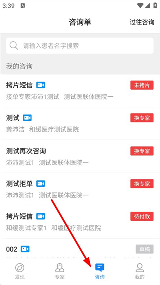 1、進入咨詢頁面可查看我的咨詢列表,包含不同狀態的咨詢訂單,還能通過搜索框輸入患者名字快速查找對應咨詢記錄,便于管理接診事務。