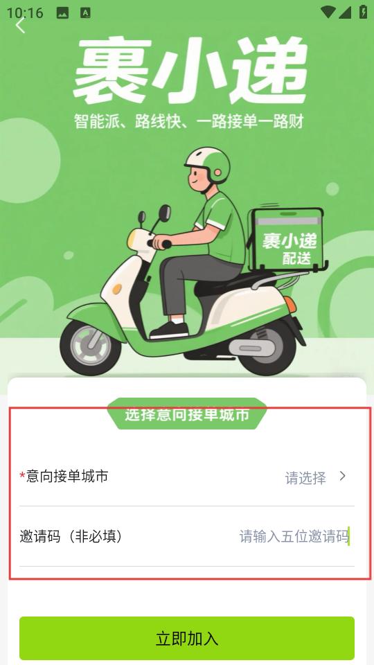 2、裹小遞加入頁,有智能派、路線快等宣傳,需選意向接單城市、填邀請碼,點立即加入成為配送員。