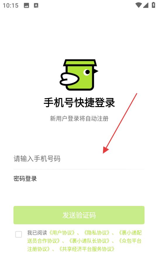 1、裹小遞登錄頁,支持手機號快捷登錄,新用戶登錄自動注冊,需勾選同意系列協議,可密碼登錄或發驗證碼登錄。