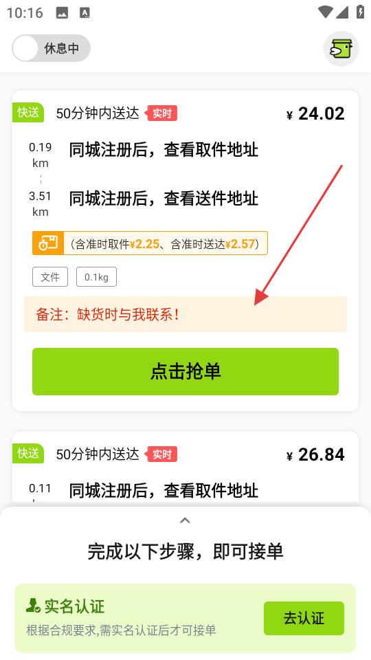 3、裹小遞訂單頁,展示待搶訂單含送達時間、費用、地址等,有點擊搶單按鈕,提示需實名認證后才可接單,可去認證。