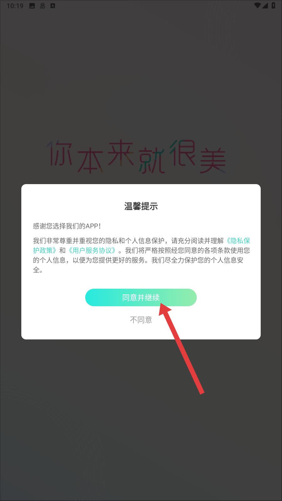 2、認真閱覽提示內容,點擊同意并繼續,完成登錄前置的協議確認流程,順利進入新功能展示界面。