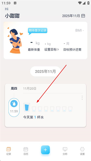 3、完成喝水記錄后在頁面查看2025年11月20日的飲水記錄,顯示今天第1杯水,可繼續添加其他時段的飲水記錄。