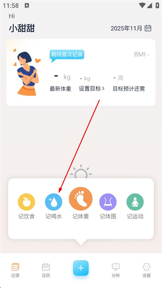3、點擊底部日歷導航欄,進入日歷界面,點擊從這里記錄今天的變化吧提示區域,錄入當日體重等信息。