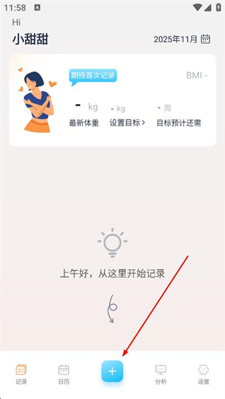 1、進入體重管理軟件首頁,查看個人信息及體重相關數據,點擊底部加號按鈕,彈出功能選擇菜單,準備記錄日常相關信息。