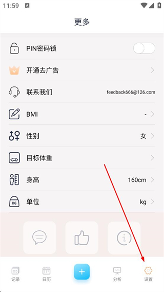 1、打開體重記錄管家APP,點擊底部導航欄右側設置圖標,跳轉后點擊界面頂部更多選項,進入功能配置頁面。