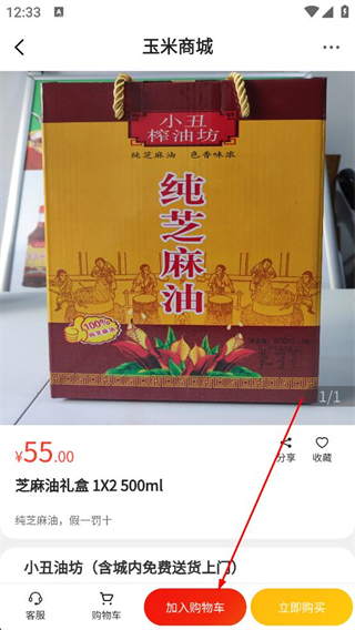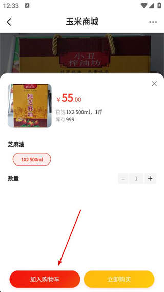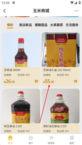 2、登錄后進入玉米商城首頁,瀏覽爆款商品列表,選擇目標商品如芝麻油禮盒,點擊進入該商品的詳情頁面。