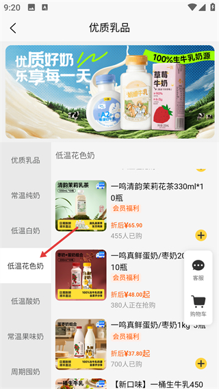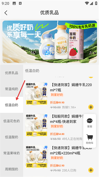 2、平臺低溫乳品區有娟姍牛乳、A2β酪蛋白牛乳,均為100生牛乳奶源,采用ESL工藝鎖鮮,營養留存更充分。