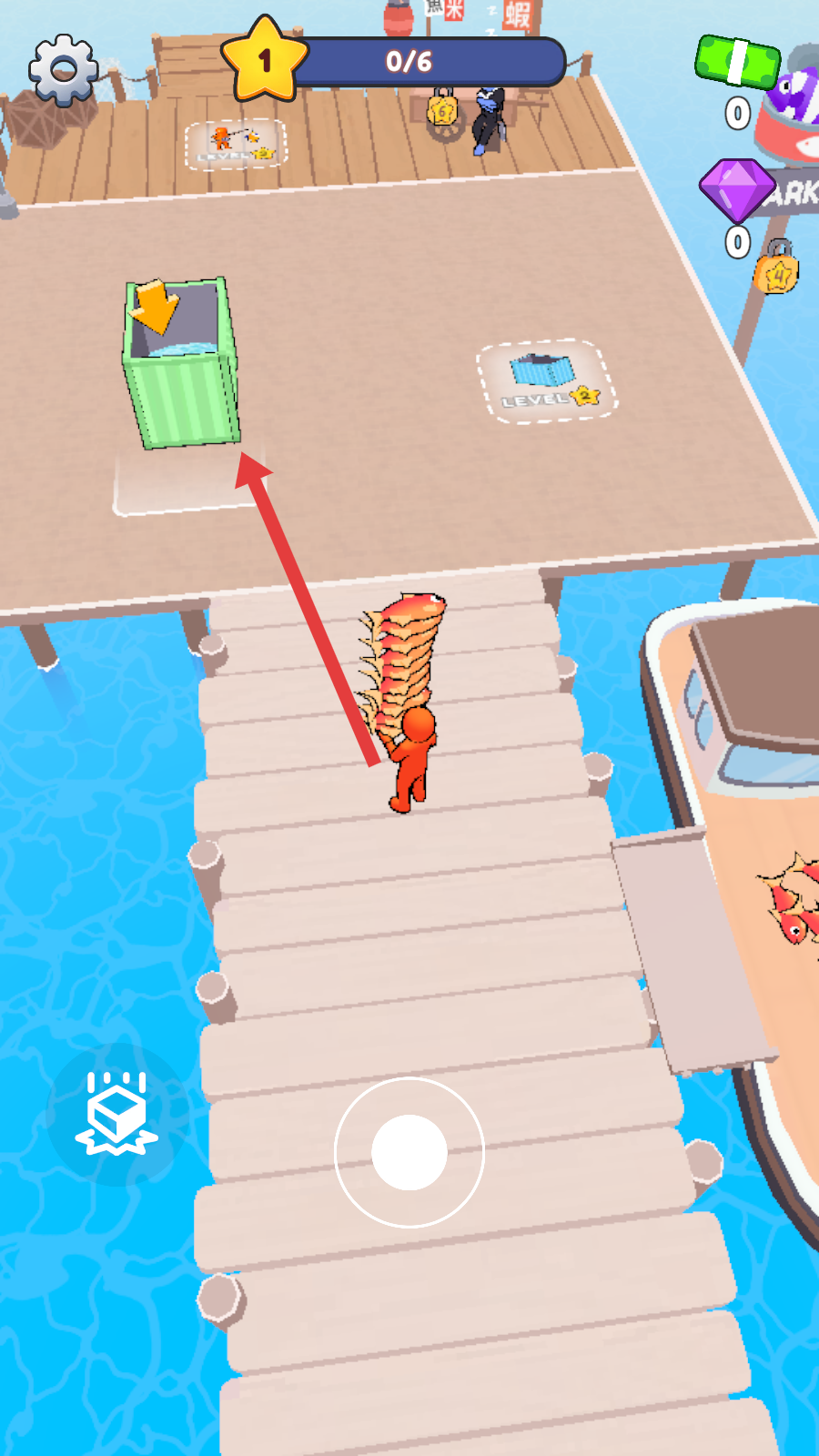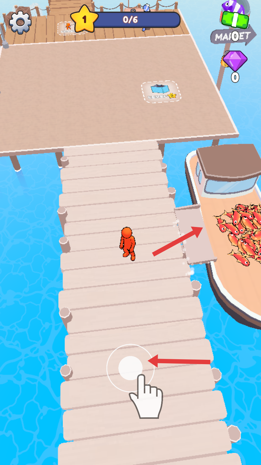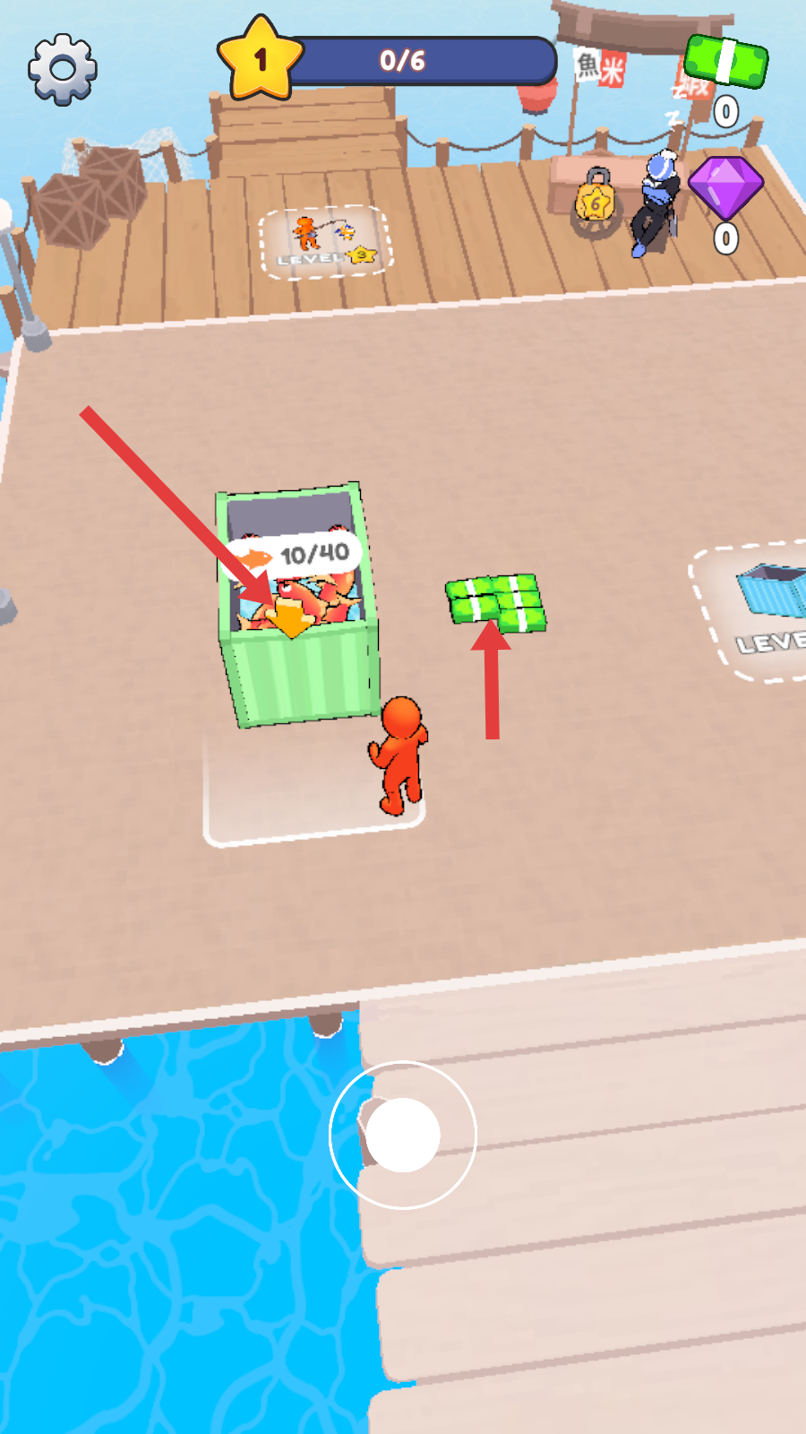 1、操控橙色小人前往碼頭邊的船只,獲取船上的魚,開始收集魚的任務,為后續經營積累資源。