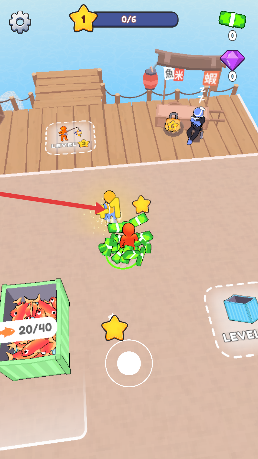 4、繼續收集魚并放入箱子,積累足夠后,會遇到其他小人,與他們互動可獲得星星等獎勵,不斷發展。