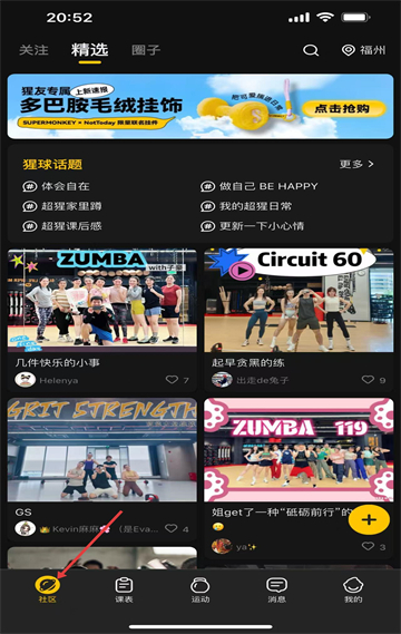 1、社區板塊有精選內容和猩球話題,展示ZUMBA、Circuit60等運動動態,供用戶交流運動生活,內容豐富多元。