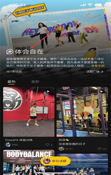 2、話題板塊有體會自在話題,用戶分享CrossFit訓練等動態,可參與話題互動,展現運動風采,互動性強。