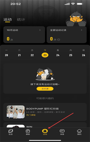 3、運動板塊可查看運動記錄,規劃運動計劃,推薦BODYPUMP等熱門課程,助力用戶科學運動,功能實用。