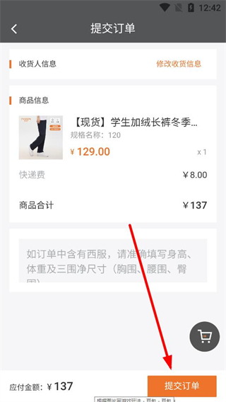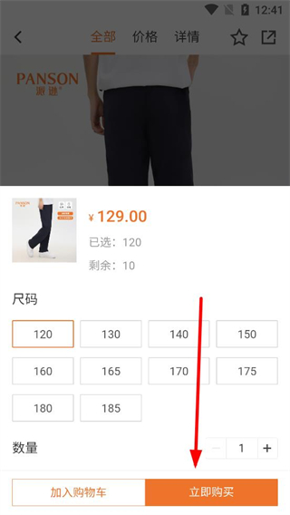 3、在規格選擇頁面選定120碼的尺碼,確認數量后再次點擊立即購買按鈕,進入提交訂單頁面。