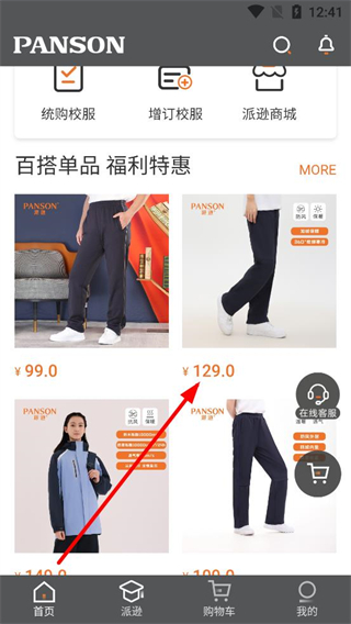 1、打開派遜通校服軟件,進入首頁后瀏覽百搭單品福利特惠板塊,選擇學生加絨長褲商品,點擊進入該商品的詳情頁面。