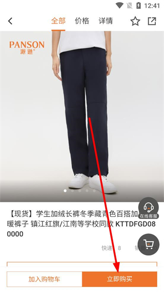 2、在商品詳情頁查看款式、價格等信息,找到立即購買按鈕,點擊進入商品規格選擇頁面。