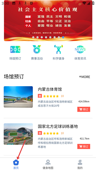 2、在首頁,找到場館預訂、賽事活動、科學健身、體育資訊等功能區,點擊場館預訂,進入場館預訂頁面。