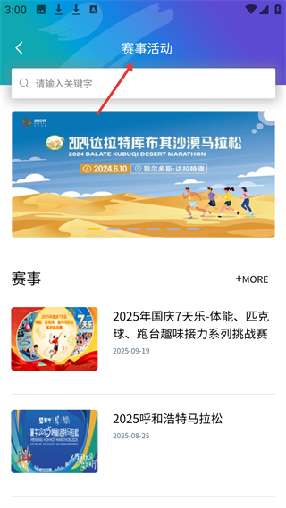 2、賽事活動展示沙漠馬拉松、國慶挑戰賽等賽事,用戶可搜索賽事,參與各類體育賽事活動,豐富體育生活。